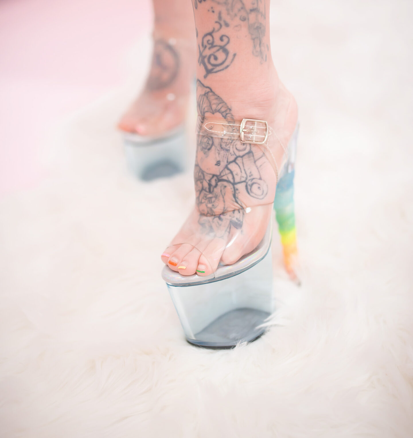 You will be in 100% extreme glitter glam with these beautiful babies. Every hot girl needs a pair of these decked out glitter unicorn platforms to add to their female fashion inspired wardrobe. With fabulous holographic/iridescent soles, it just adds the final touch that really completes the shoe. These heels feature a tinted platform bottom and glittered ombre rainbow heel like no other. It's a simple fade rainbow, but the touch of glitter really gives this shoe the added edge. I myself have a neon pink Vaporwave bedroom, so wearing these under UV/ neon lights really makes the heel glow! It's such a wonderful look and a brilliant idea to wear if you are going to a club or for pole dancing!