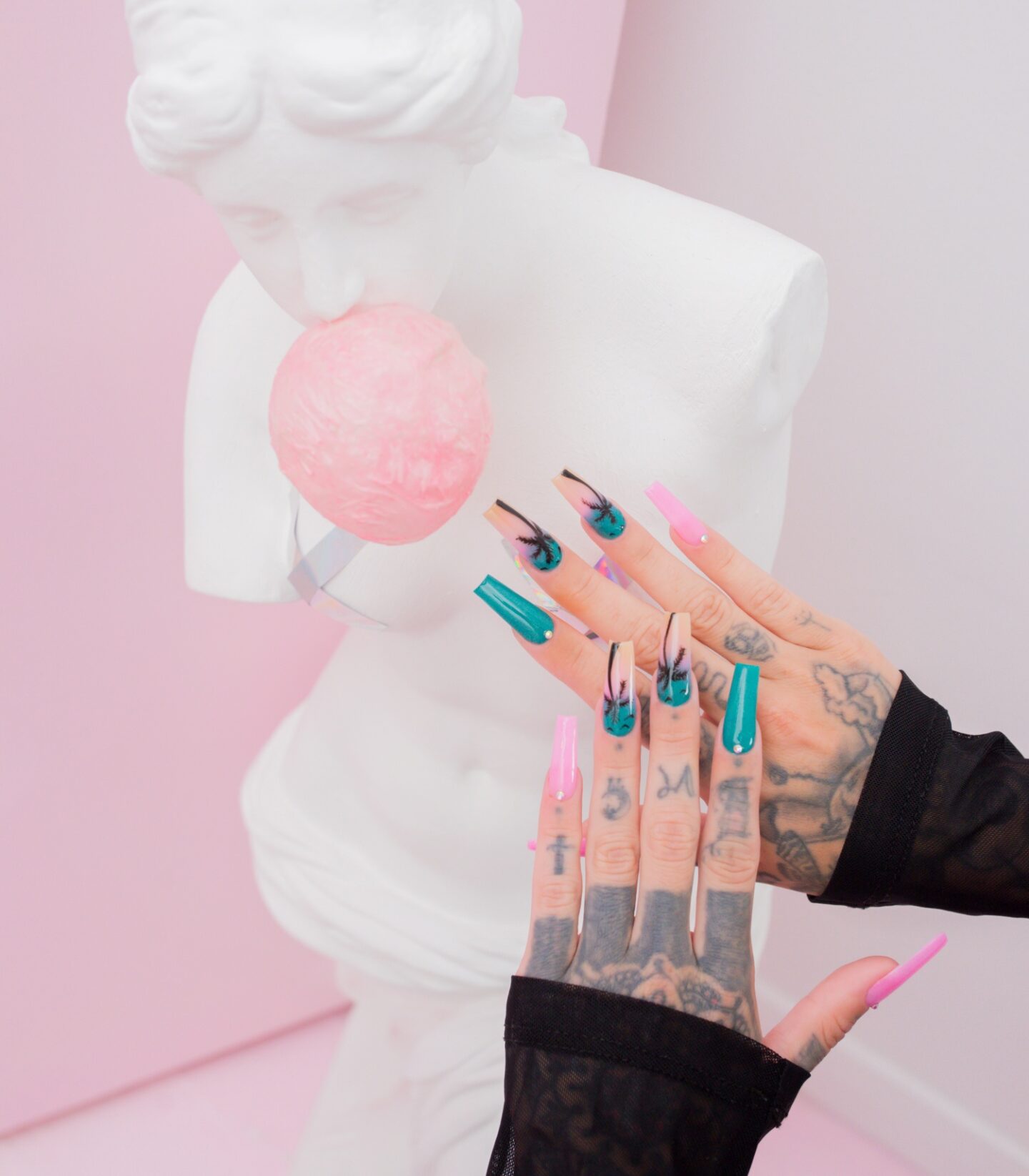 My absolute favourite nails of this year, my Miami Beach inspired nails. I got these done in a little nail salon just outside where I live. I love everything vaporwave, and I knew I was going on holiday to Spain in the summer; it was a perfect opportunity to get these nails done for the occasion. These amazing nails were made with acrylic and hand painted with gel nail polish. The male artist who created these, added in these little diamondizes to really glam up this set for me. They were just perfect! Even the nail tech used me as a model to advertise their business after being so proud of the work they had done. Overall, these were just what I imagined, and couldnโt have asked for a better set done.