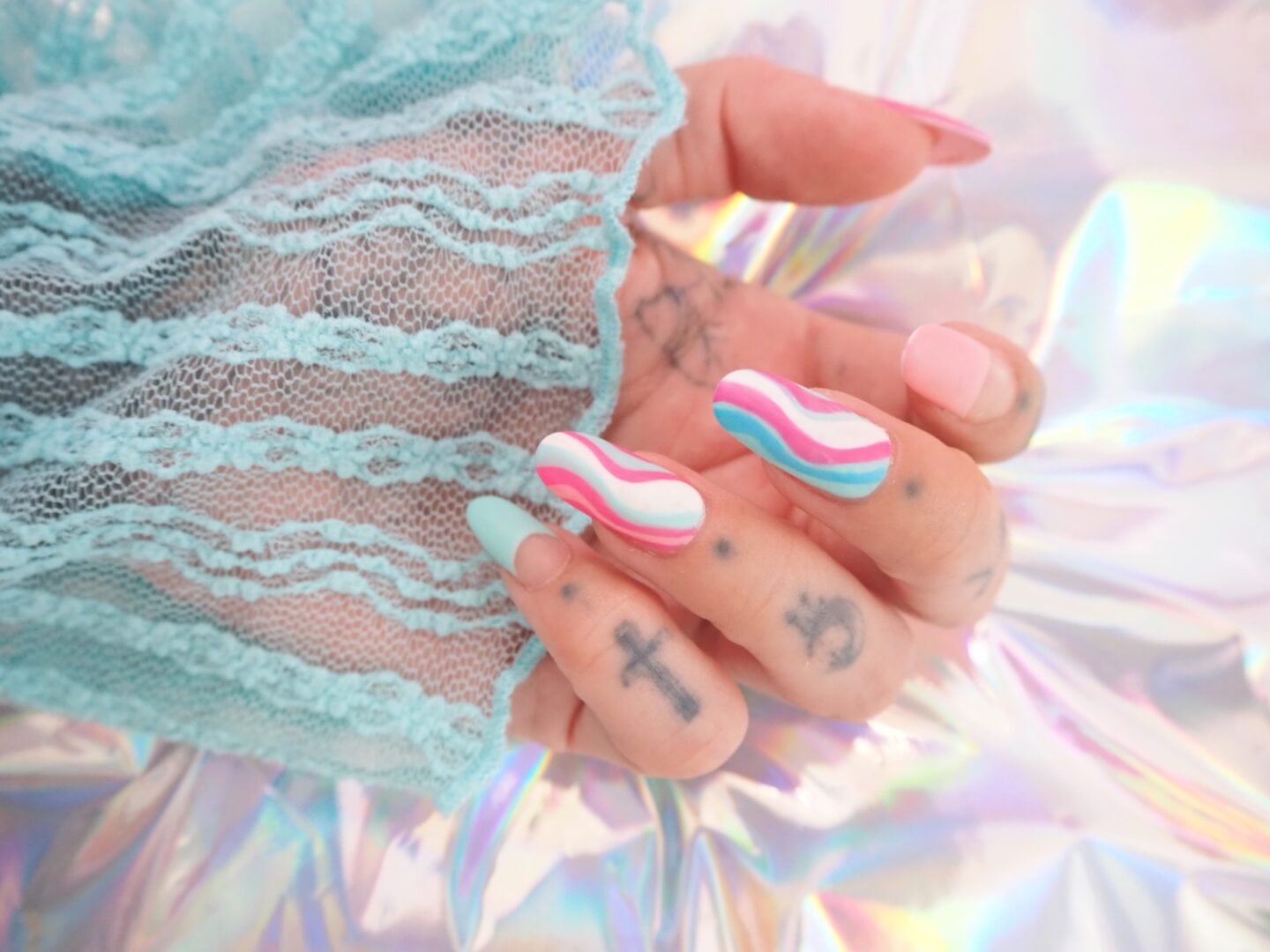 So in 2023, we saw a lot of the wave trend that nail artists were doing. I did jump on the band wagon with this one! I adore this style. Keeping up with my own aesthetic, I designed these nails and created them to match all the colours I use in my social media posts. Vaporwave is a huge part of what I am inspired by, so for these I used my holographic pillows as a background. Using acrylic to create the nail and shape them using my diffuser stack nail files, I rounded these to a nice oval shape. For the colours, I picked out two shades of blue, two shades of pink and a nice bright white. The polish I used were all gloss gel. However, one of my favourite things to do with nails is use a matt top finish. This just creates such a nice effect, especially on these beauties! These were really fun to do, I think I might do these again! But with what colours next?