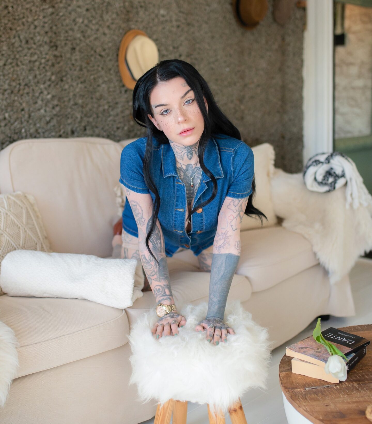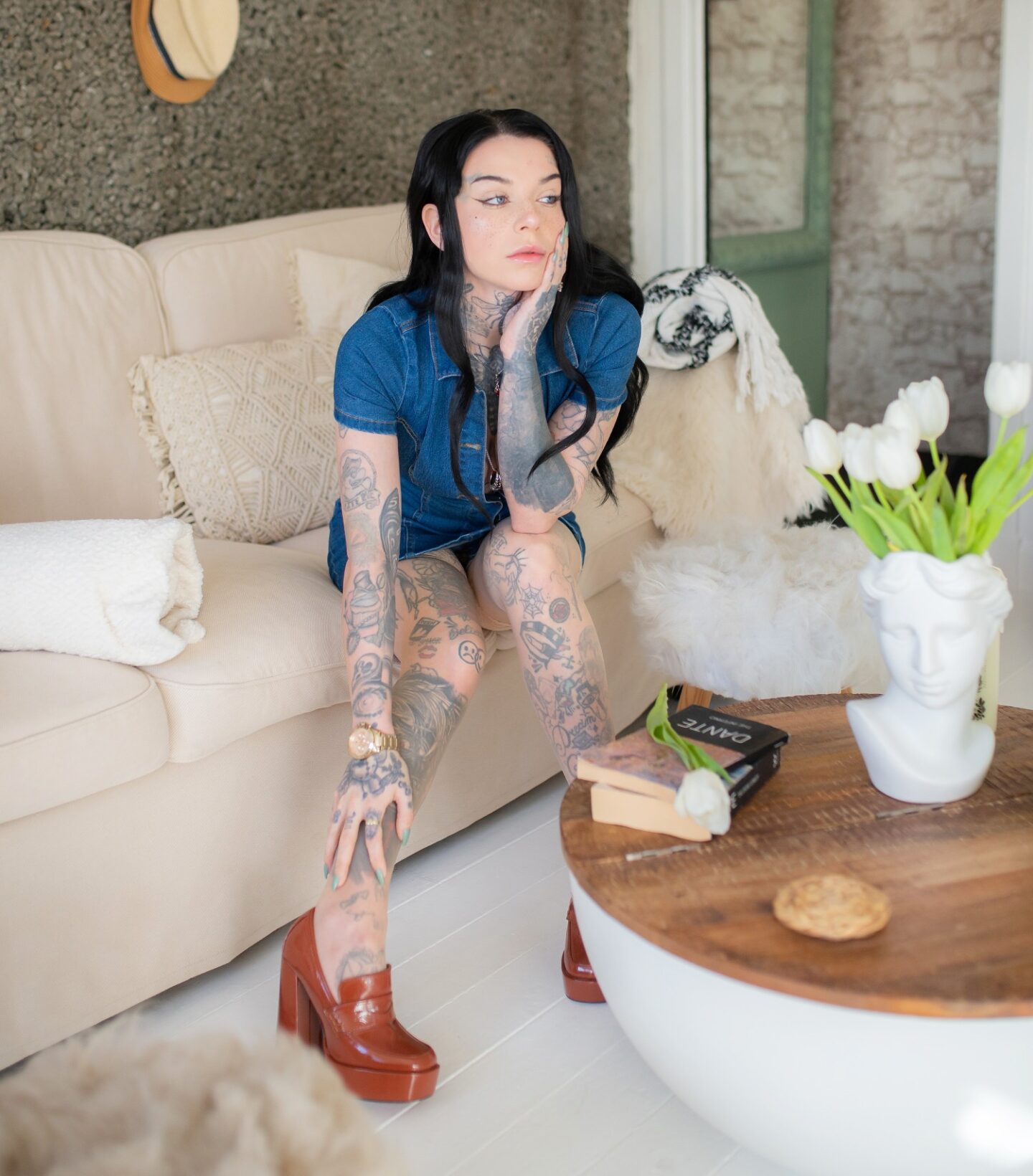 Once more, because I am in awe with my boho living room aesthetic, so I used this as my base. I love how all the tones match in, and it's just such a nice zen environment to use for my final looks. This really works well with the blue denim dress I have on, making me stand out in the pictures more! Flowers for spring is a must, so for this outfit look I used a nice bunch of white tulips. Taking one out of the bunch to hold in some of my pictures for a cute but sexy vibe.