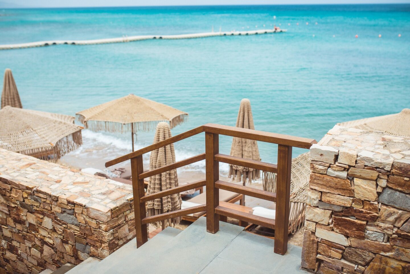 Lesante Blu actually sits right on the beach, so you can make your way straight from the pool area or your room (using the stairs that lead down onto it). With sun loungers laid out all the way along in the sand, you can soak up the rays, and if you need a little cool down, what's better than walking a few feet in front of you, right into the sea for a dip. Because I like soft sand and not rocky this was perfect. Everywhere else I have stayed in Greece has had rocky beaches, so this was such a nice difference! I did some photos down at the beach on the pier; a lovely evening heading down to the beach, with a glass of champagne and taking a walk up the pier to enjoy the sundown. Blissful moments indeed.