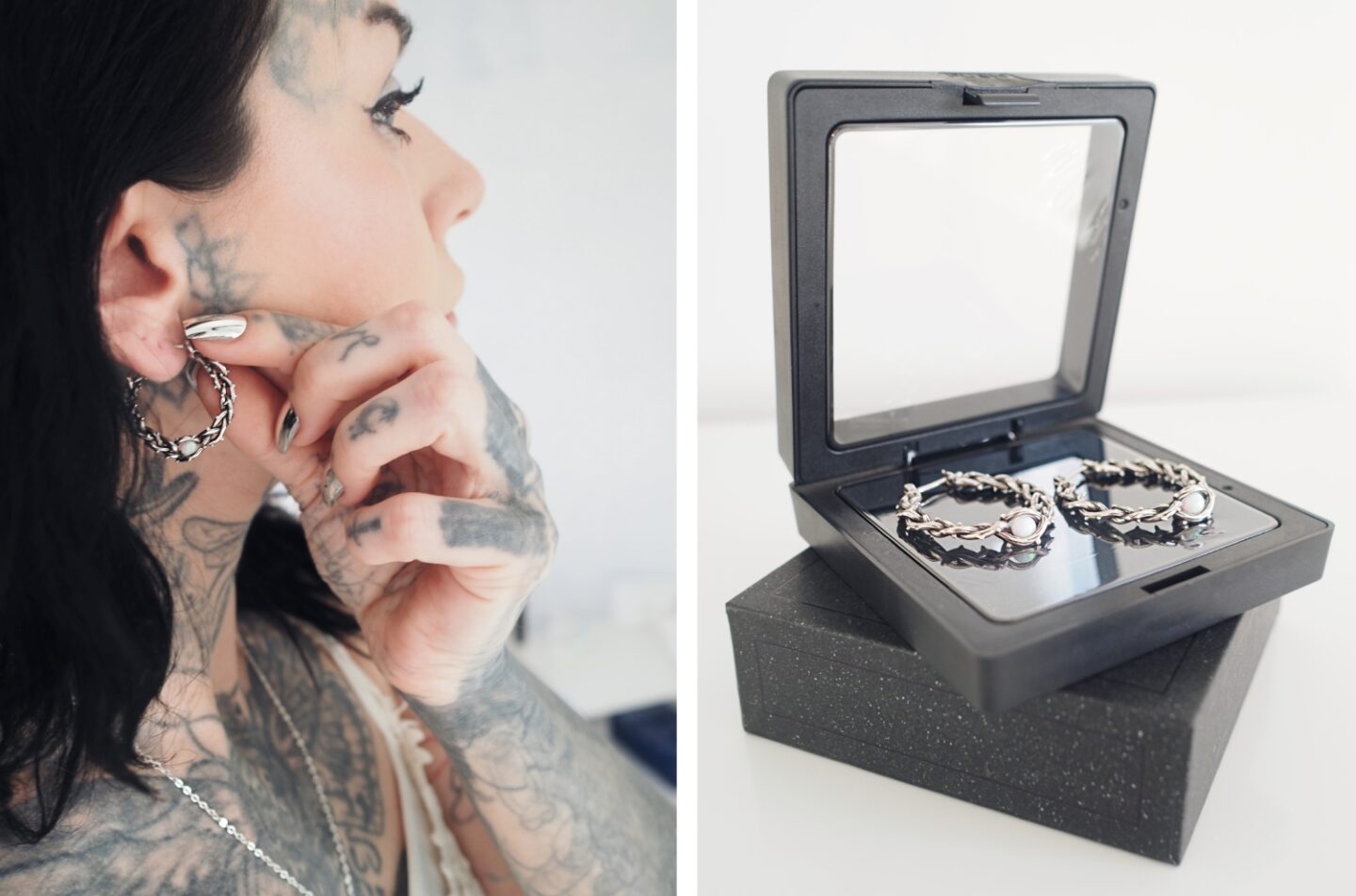 The textured design of the earrings captures the light beautifully, especially with the opal stone used at the centre of the earring itself. Creating subtle reflections that enhance their visual impact. These earrings are versatile enough to complement both casual and high-fashion ensembles, making them an essential statement piece for those who seek to stand out. When worn, the earrings perfectly accentuate a confident aesthetic, harmonizing effortlessly for those who are alternative or have bold tattoos with a contemporary style.