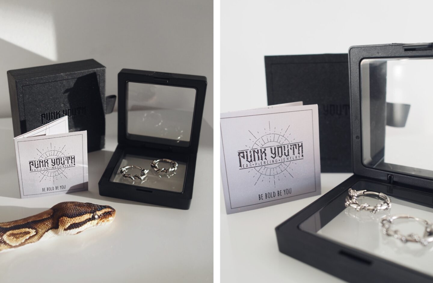 As you can see in my image above, Anubis is one of my snakes. He enjoyed being involved and loves getting in front of the camera, (maybe a little too much, haha). I thought I would incorporate him in this as it was perfect for the Rebirth Cycle earrings. At the heart of my presentation in these images, is a striking display case, which frames the earrings as though they were treasures in a gallery. The transparent front allows an unobstructed view, inviting you to appreciate the intricate craftsmanship of the pieces before even opening the box. This modern touch is balanced by the gothic-inspired logo and tagline, โBe Bold Be You,โ etched on the accompanying card. The typography and starburst design is a subtle nod to the rebellious, edgy spirit Punk Youth is known for.